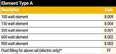 For an all electric towel rail/radiator, fluid filling must be purchased. Electric only elements will be fitted RH side unless otherwise specified. For dual fuel installations, purchase T piece separately.
